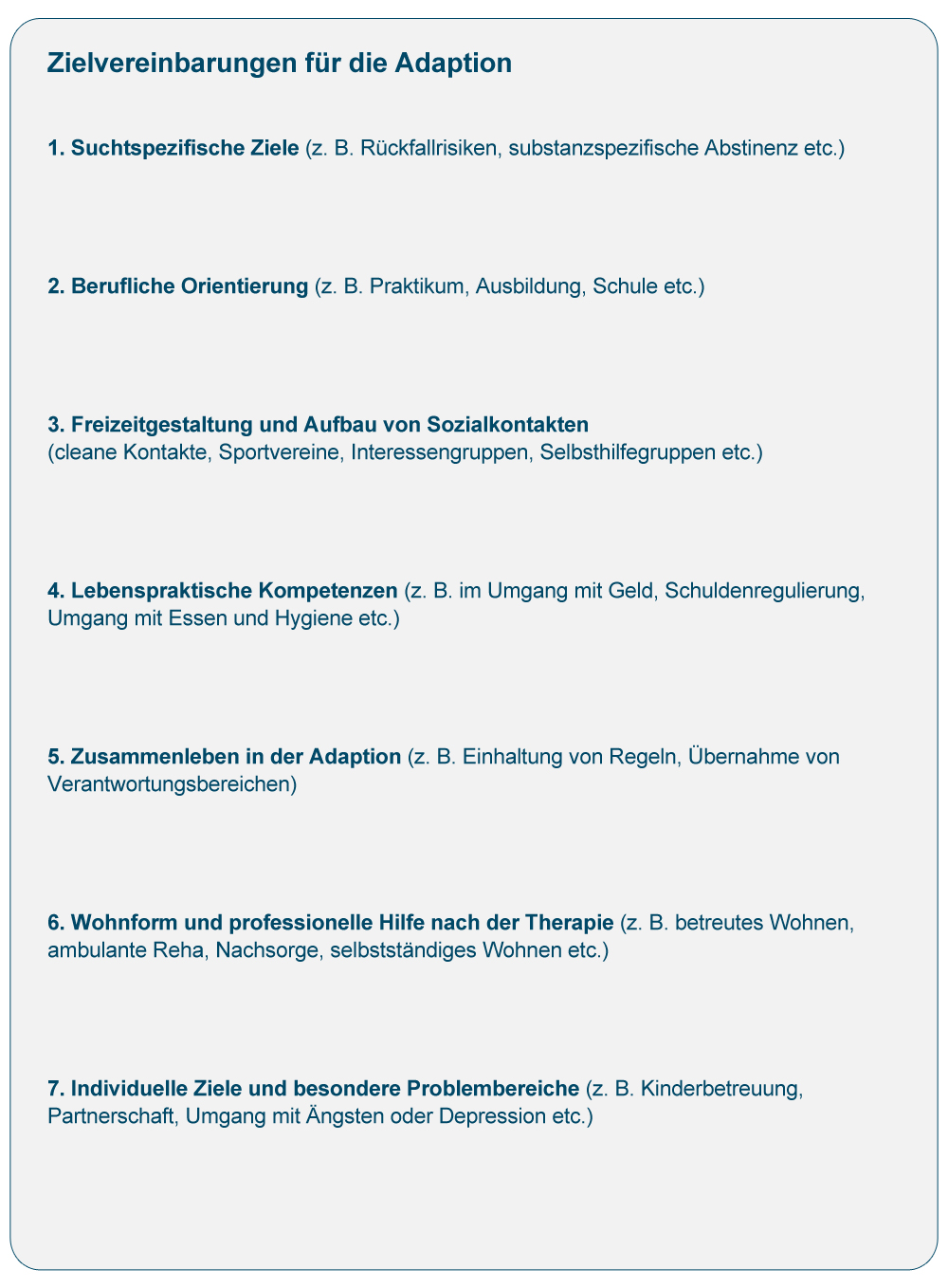 Dieses zweiteilige Beispielmaterial aus einer stationären Einrichtung für Entwöhnungsbehandlungen (Adaption) betont den vertraglichen Charakter der Reha-Zielvereinbarung. Sowohl Rehabilitand als auch Behandler geben eine Erklärung ab und bekräftigen diese durch ihre Unterschrift. Im zweiten Teil werden Ziele für verschiedene Bereiche spezifiziert. Im Rahmen der Psychotherapie können die Rehabilitanden zur Vorbereitung mögliche Ziele in einer umfangreichen Liste gewichten. Im Verlauf der Adaption werden Fallkonferenzen sowie zwei Therapieplanungsgespräche mit den Rehabilitanden geführt (siehe Praxisbeispiel 18).